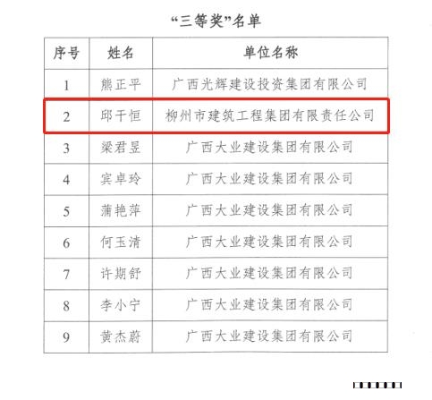 2022年11月9日,廣西工程建設(shè)質(zhì)量安全管理協(xié)會發(fā)布《關(guān)于公布2022年全區(qū)房建市政工程線上質(zhì)量知識競賽活動結(jié)果的通知》,柳建集團(tuán)公司榮獲集體“優(yōu)秀組織獎”,邱干恒同志榮獲個人“三等獎”。