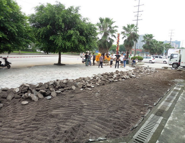 施工人員在忙碌的鋪設透水磚↑